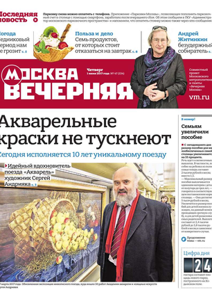 «Вечерняя Москва» — ежедневная российская вечерняя газета, старейшее из вечерних изданий в России, учрежденное в 1923 году. Выходит пять дней в неделю, кроме субботы и воскресенья. Отличается тем, что рассказывает о событиях еще не завершившегося дня. Оперативно освещает хронику и особенности жизни Москвы, охватывает все слои общества и большинство профессиональных и возрастных групп читателей.Издание представлено тремя выпусками – утренним ежедневным, вечерним (выходит три раза в неделю), еженедельным (выходит по четвергам).