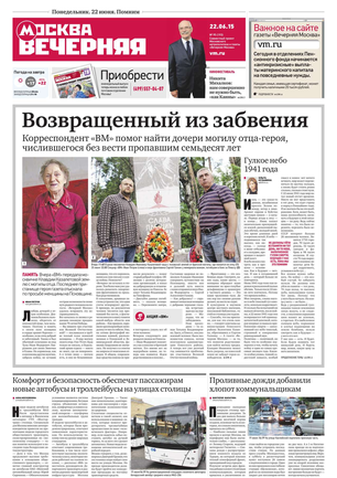 Еженедельный выпуск «Вечерней Москвы» — это значимые события недели, афиша города, новости из сферы отдыха и развлечений, телепрограмма с анонсами и комментариями, авторские колонки журналистов и авторитетные мнения экспертов, детская страничка, специальная рубрика «Золушка», интересные репортажи о необычных судьбах московских жителей, постоянные конкурсы и викторины.