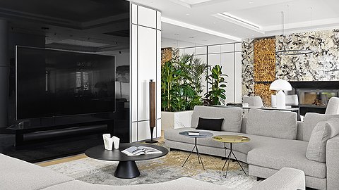 Заказчиками Оксаны Сальберг–Вачнадзе стала московская семья с двумя детьми. Они хотели получить интерьер в спокойных серых тонах с яркими акцентами. Ставку дизайнер сделала на сочетание разных материалов (натуральный камень, дерево, керамогранит) — одним словом, фактур в схожих оттенках из серо–бежевой палитры — и постаралась «не перегрузить» пространство. Оно и в самом деле масштабное, и тут можно было применить множество фишек. Но именно из–за размера оно потребовало лаконичных, крупных решений: таких, как камин в отделке из натурального гранита Alaska White, единый серый цвет стен, белые панели с серыми рустами, огромная лаковая панель за телевизором, позволяющая спрятать чёрный телевизор на чёрной панели, необыкновенной красоты слэб мрамора Macchia Vecchia в ванной комнате. Большое пространство объединяет отделка пола: для неё выбран максимально широкий формат доски (260 мм), который положили во всех жилых помещениях. Стиль интерьера Оксана называет современным минимализмом, который отличается от минимализма 2000–х годов разнообразием материалов, фактур, оттенков и отсутствием строгой геометрии.